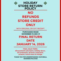 At Westcott Mercantile, we offer exchanges or store credit. We do not offer refunds. Items eligible for return must have a receipt, original tags, and returned within 10 days of purchase. Jewelry returns require that the white WM tag remains attached for exchange or store credit. Please note that below items are final sale and cannot be returned. •ornaments & holiday decor •artwork •vintage goods •paper goods •notecards •food and drink products •French ceramic hens We reserve the right to refuse returns if items are not in new condition. Thank you for understanding our small business policies.